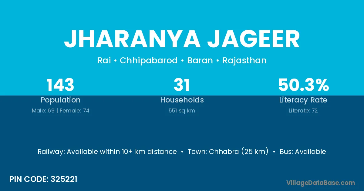 Chhabra (25 km) is the nearest town to Jharanya Jageer village for major economic activities and is located approximately 25 km away.