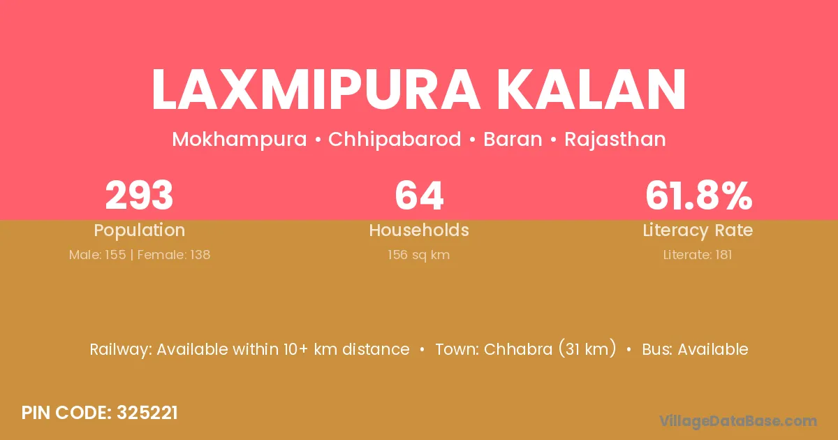 Laxmipura Kalan village has a total population of 293 people, of which 155 are males and 138 are females.