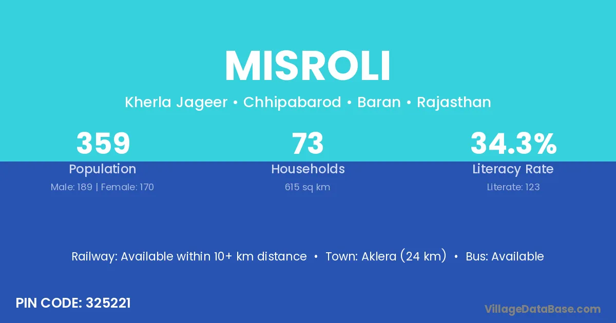Aklera (24 km) is the nearest town to Misroli village for major economic activities and is located approximately 24 km away.