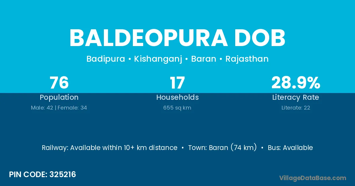 Baran (74 km) is the nearest town to Baldeopura Dob village for major economic activities and is located approximately 74 km away.