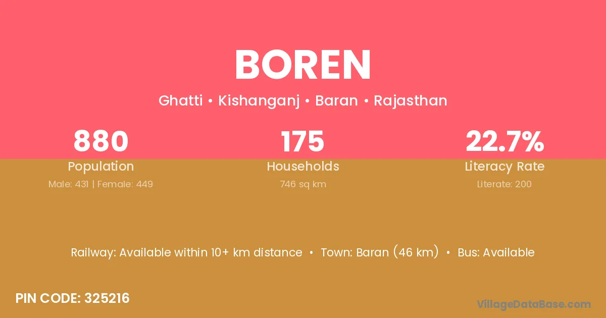 Baran (46 km) is the nearest town to Boren village for major economic activities and is located approximately 46 km away.