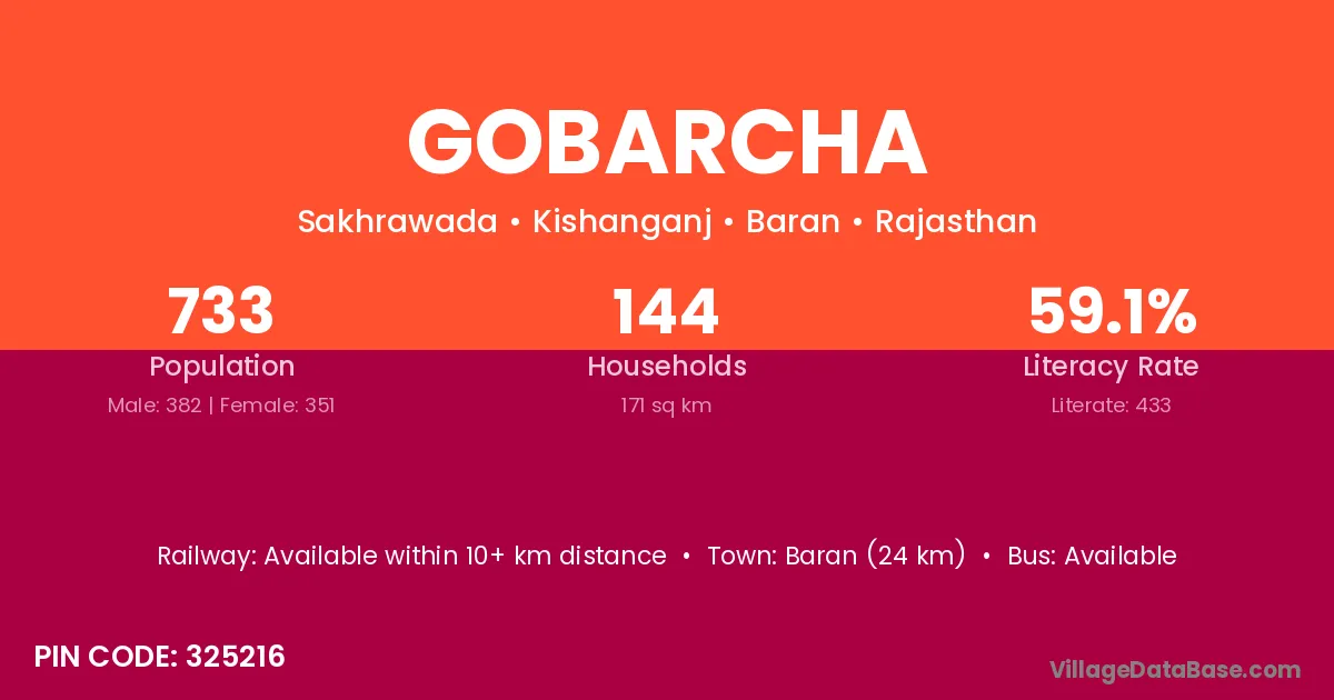 Baran (24 km) is the nearest town to Gobarcha village for major economic activities and is located approximately 24 km away.