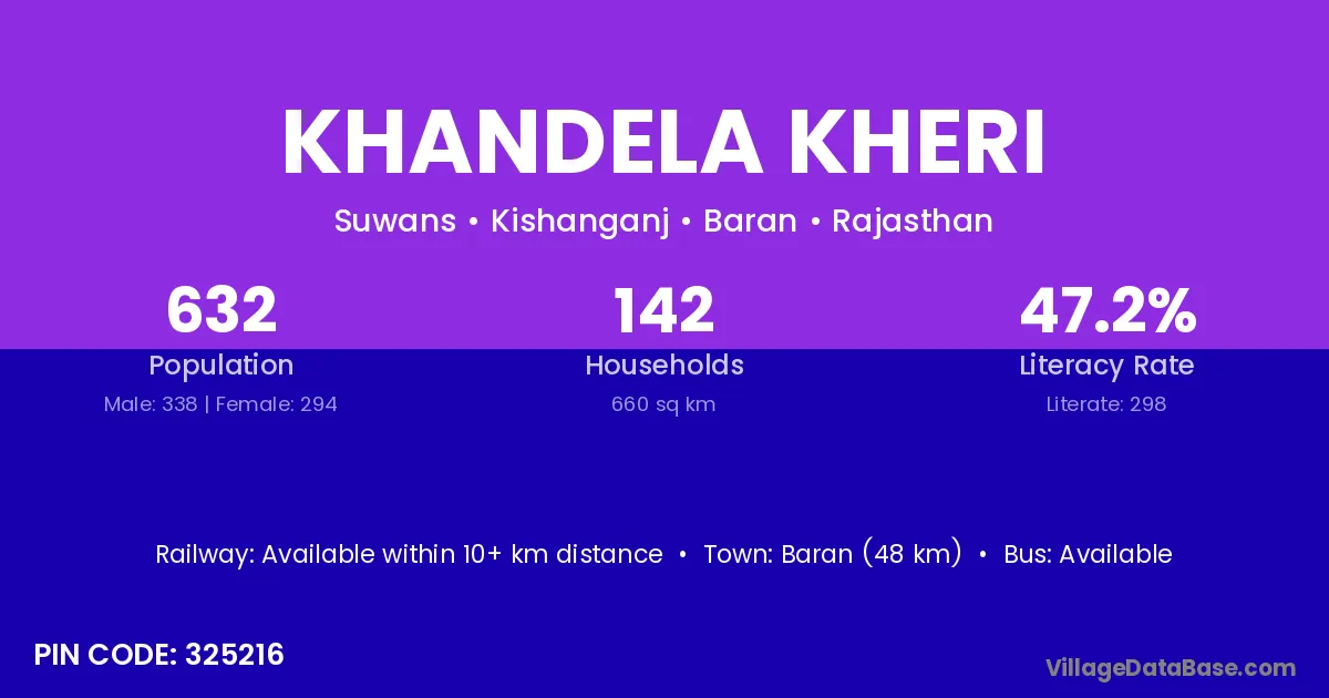 Baran (48 km) is the nearest town to Khandela Kheri village for major economic activities and is located approximately 48 km away.