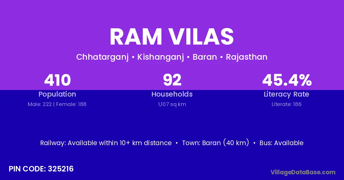 Baran (40 km) is the nearest town to Ram Vilas village for major economic activities and is located approximately 40 km away.