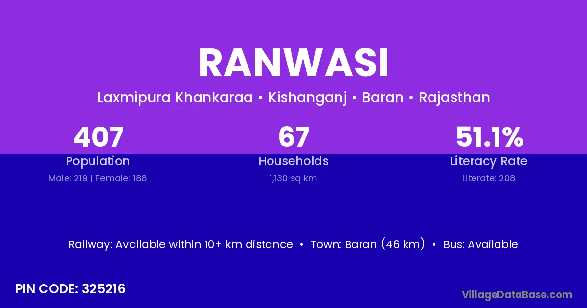 Baran (46 km) is the nearest town to Ranwasi village for major economic activities and is located approximately 46 km away.