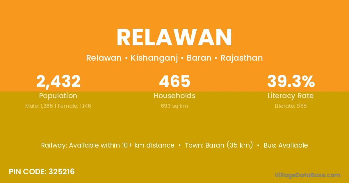 Baran (35 km) is the nearest town to Relawan village for major economic activities and is located approximately 35 km away.