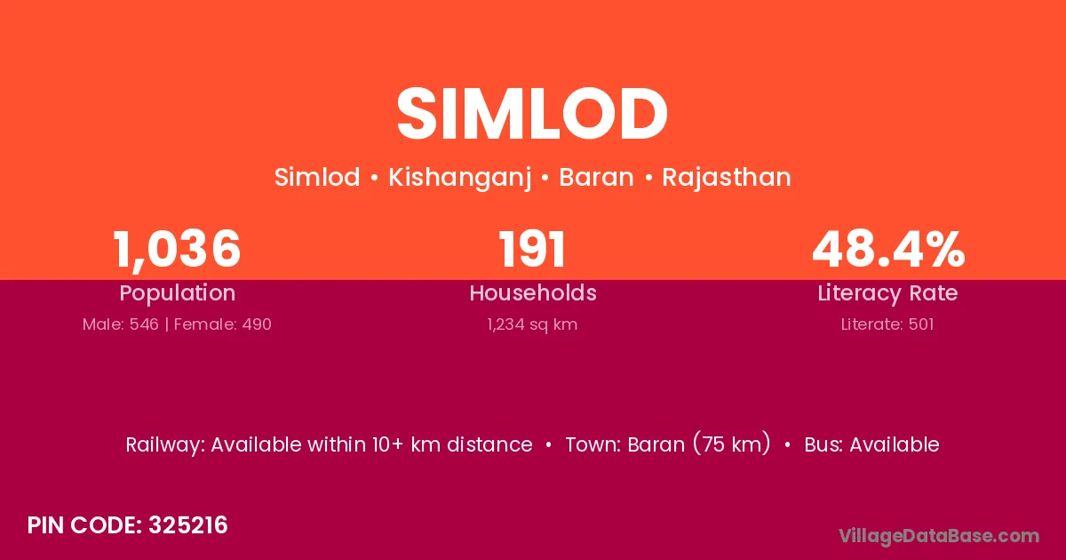 Baran (75 km) is the nearest town to Simlod village for major economic activities and is located approximately 75 km away.