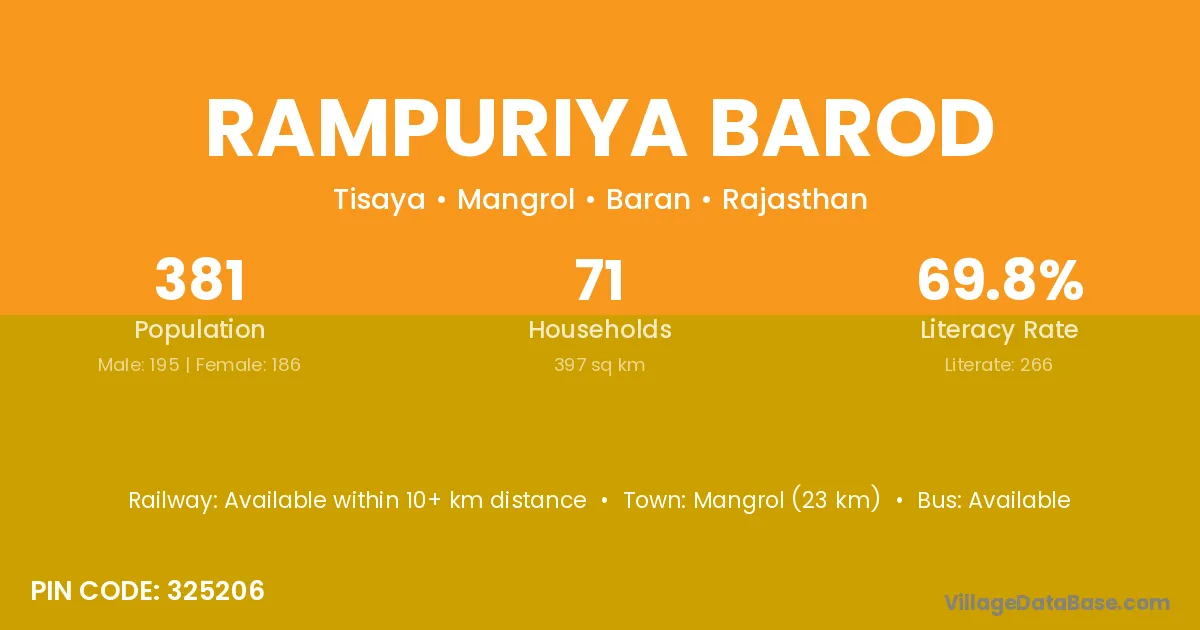 Mangrol (23 km) is the nearest town to Rampuriya Barod village for major economic activities and is located approximately 23 km away.
