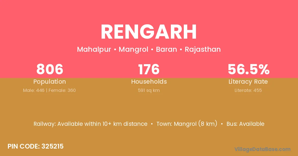 Mangrol (8 km) is the nearest town to Rengarh village for major economic activities and is located approximately 8 km away.