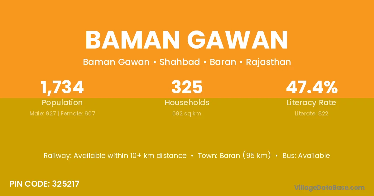 Baran (95 km) is the nearest town to Baman Gawan village for major economic activities and is located approximately 95 km away.