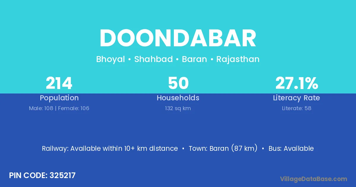 Baran (87 km) is the nearest town to Doondabar village for major economic activities and is located approximately 87 km away.