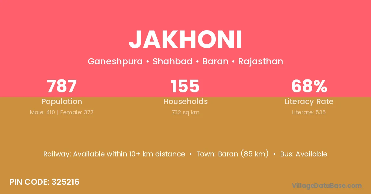 Baran (85 km) is the nearest town to Jakhoni village for major economic activities and is located approximately 85 km away.