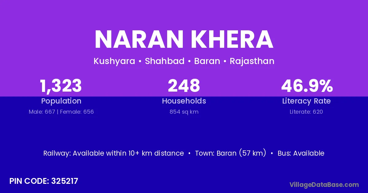 Baran (57 km) is the nearest town to Naran Khera village for major economic activities and is located approximately 57 km away.