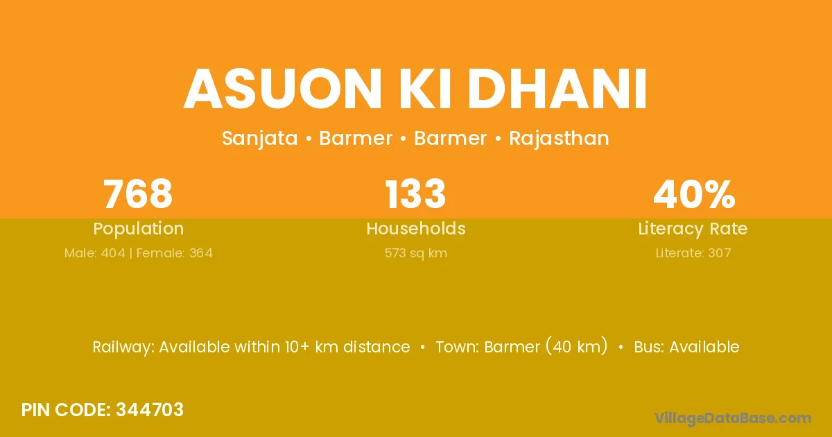 Barmer (40 km) is the nearest town to Asuon Ki Dhani village for major economic activities and is located approximately 40 km away.