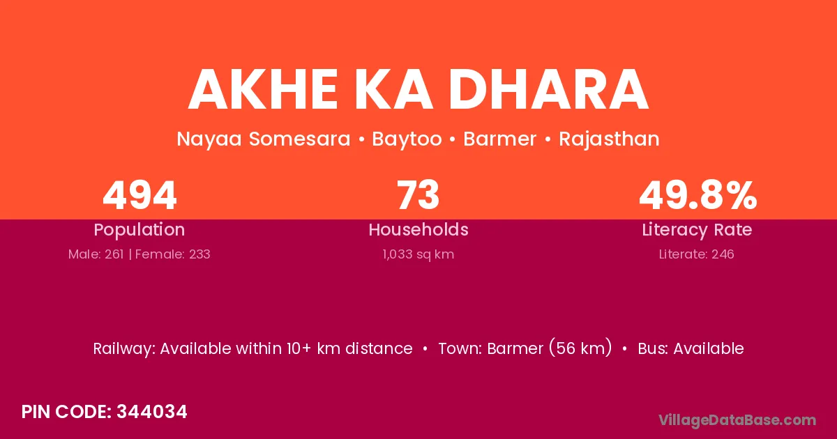 Barmer (56 km) is the nearest town to Akhe Ka Dhara village for major economic activities and is located approximately 56 km away.
