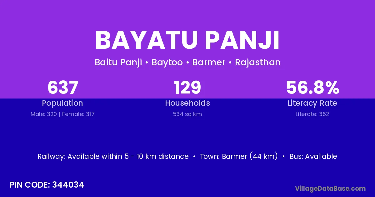 Barmer (44 km) is the nearest town to Bayatu Panji village for major economic activities and is located approximately 44 km away.