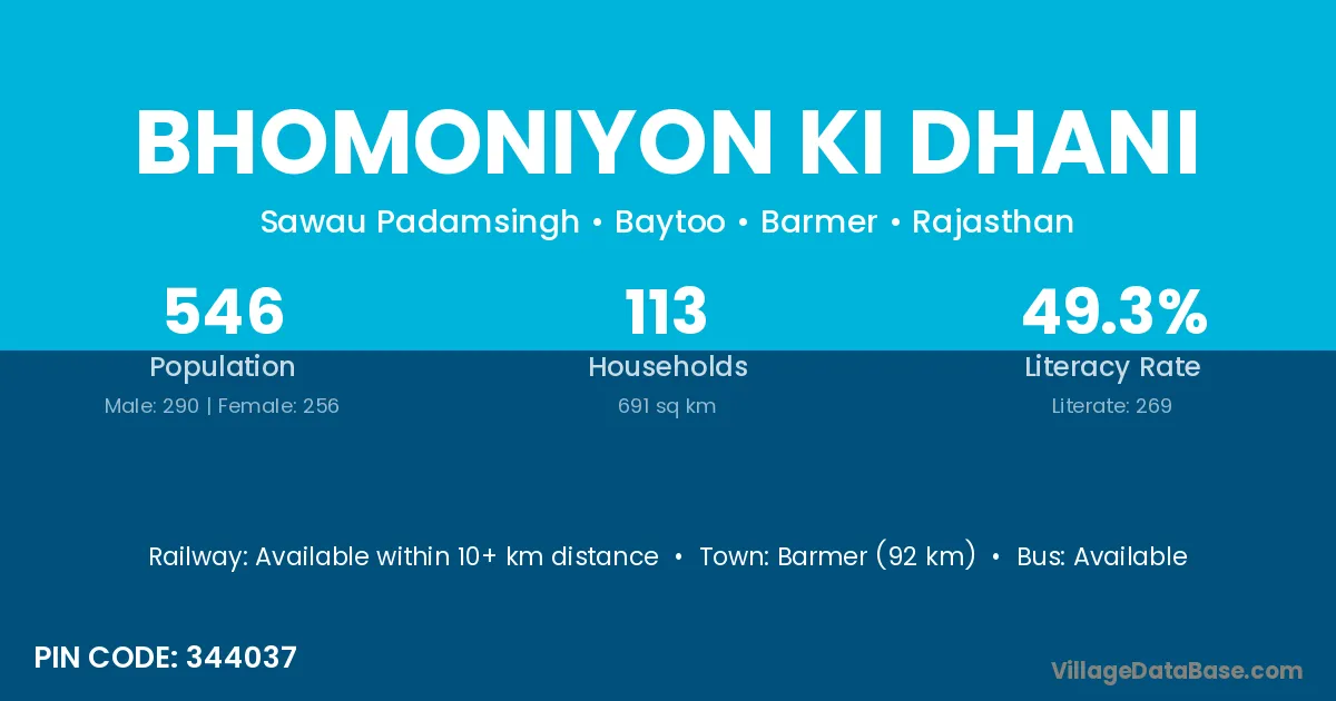 Bhomoniyon Ki Dhani village has a total population of 546 people, of which 290 are males and 256 are females.