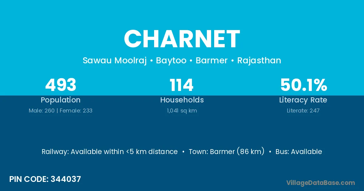 Barmer (86 km) is the nearest town to Charnet village for major economic activities and is located approximately 86 km away.
