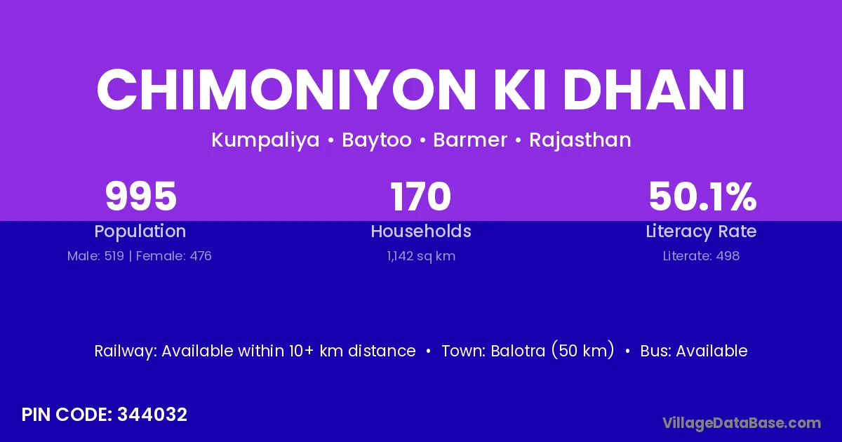 Chimoniyon Ki Dhani village has a total population of 995 people, of which 519 are males and 476 are females.