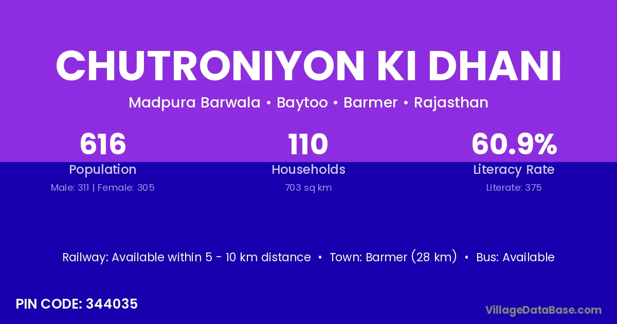 Chutroniyon Ki Dhani village has a total population of 616 people, of which 311 are males and 305 are females.