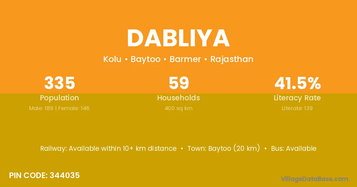 According to Census 2011 information, the village code of Dabliya village is 344035.