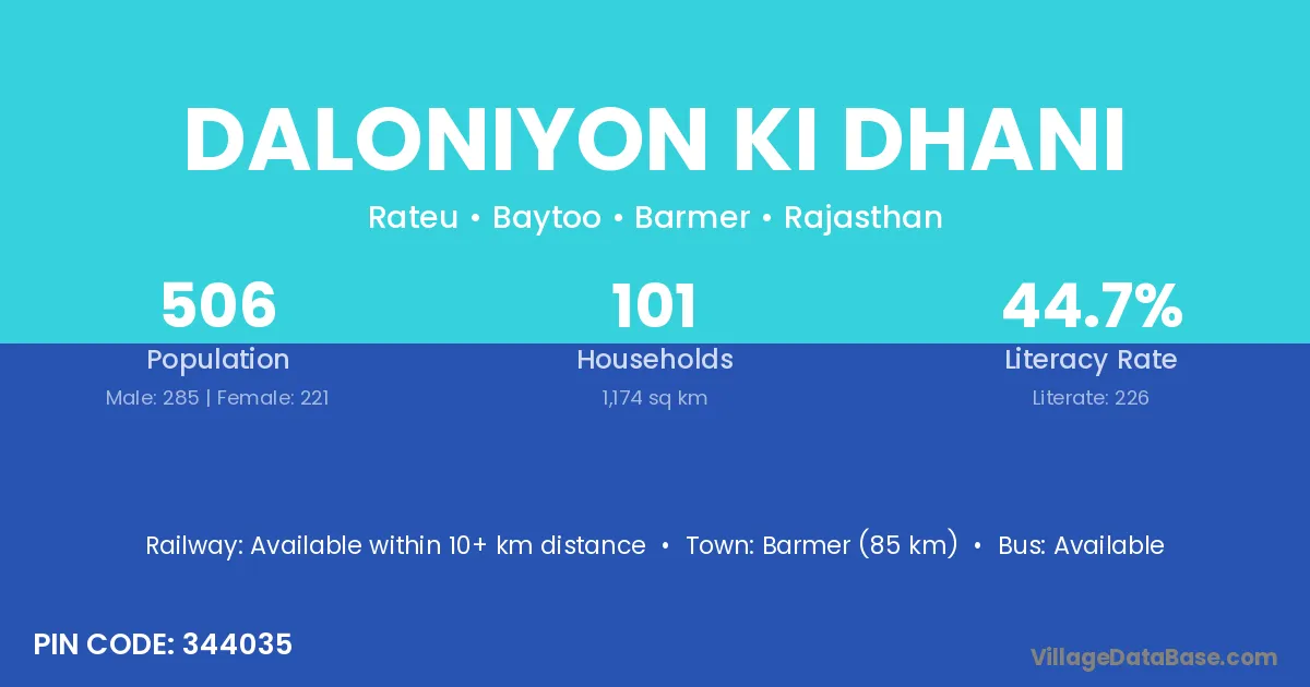 Barmer (85 km) is the nearest town to Daloniyon Ki Dhani village for major economic activities and is located approximately 85 km away.