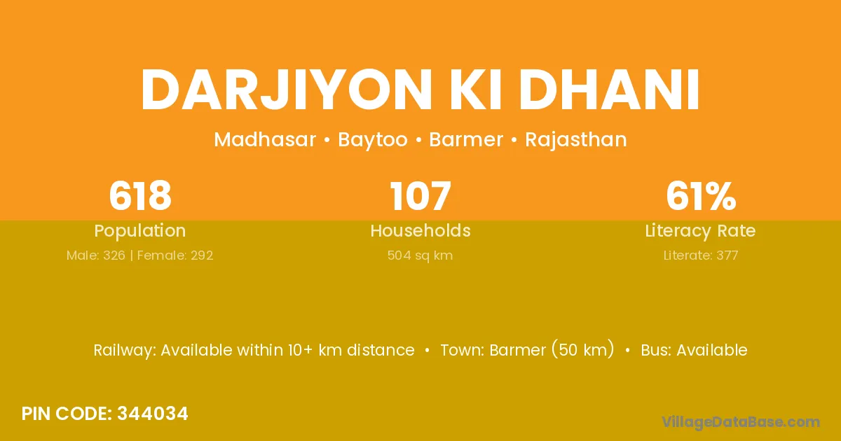 Barmer (50 km) is the nearest town to Darjiyon Ki Dhani village for major economic activities and is located approximately 50 km away.