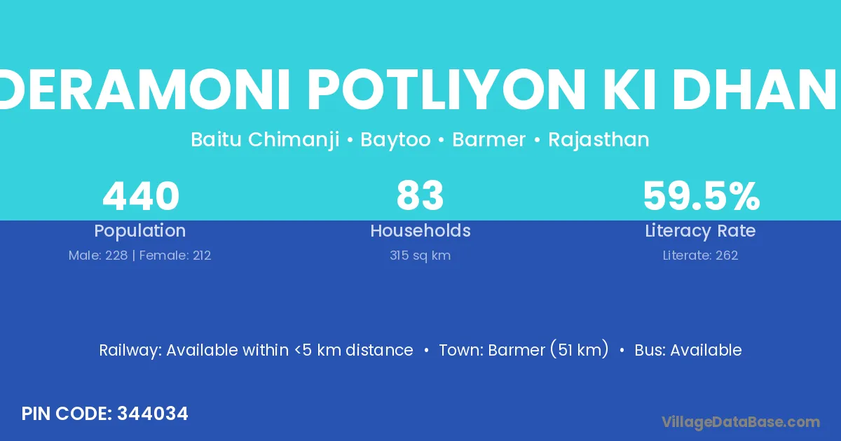 Deramoni Potliyon Ki Dhani village has a total population of 440 people, of which 228 are males and 212 are females.