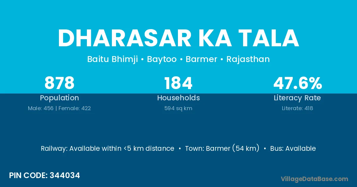 Dharasar Ka Tala village has a total population of 878 people, of which 456 are males and 422 are females.