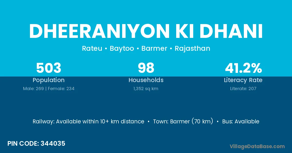 Dheeraniyon Ki Dhani village has a total population of 503 people, of which 269 are males and 234 are females.