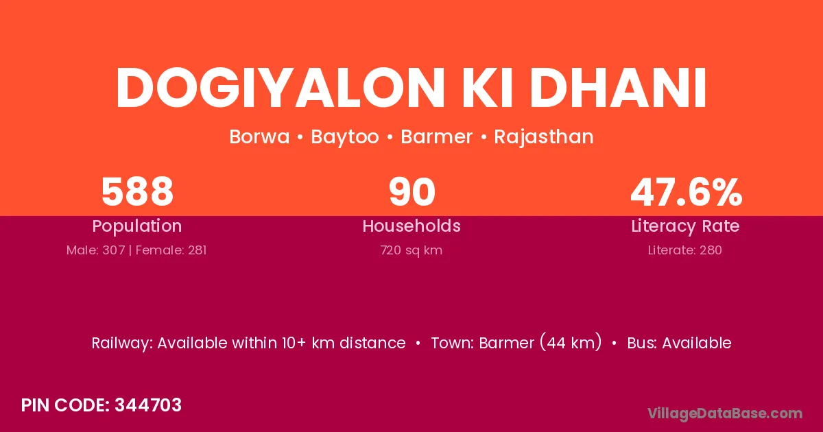 Barmer (44 km) is the nearest town to Dogiyalon Ki Dhani village for major economic activities and is located approximately 44 km away.