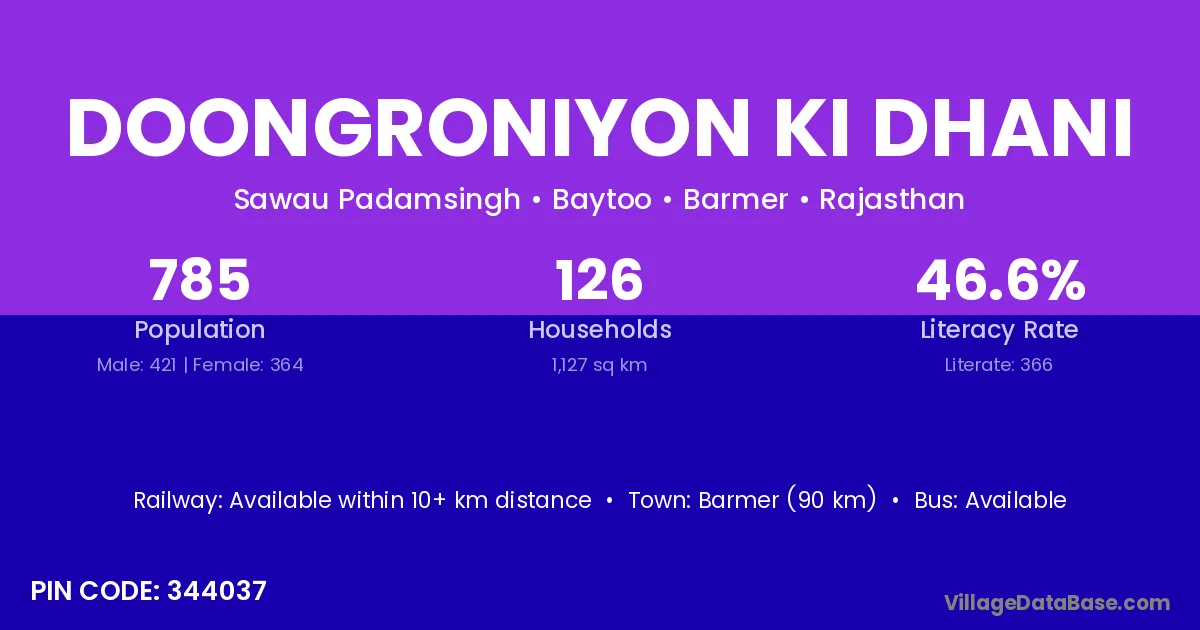 Doongroniyon Ki Dhani village has a total population of 785 people, of which 421 are males and 364 are females.