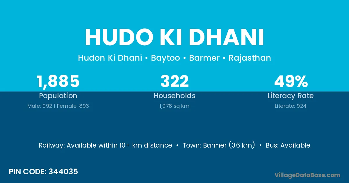 Barmer (36 km) is the nearest town to Hudo Ki Dhani village for major economic activities and is located approximately 36 km away.