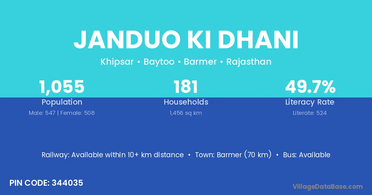 Barmer (70 km) is the nearest town to Janduo Ki Dhani village for major economic activities and is located approximately 70 km away.