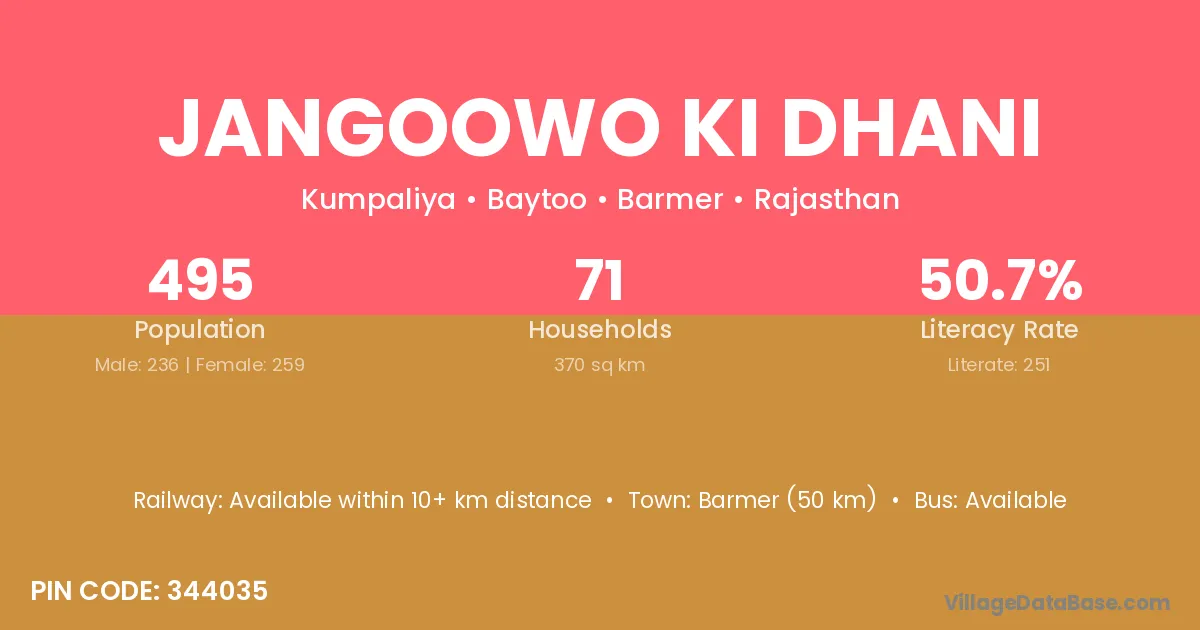 Jangoowo Ki Dhani village has a total population of 495 people, of which 236 are males and 259 are females.