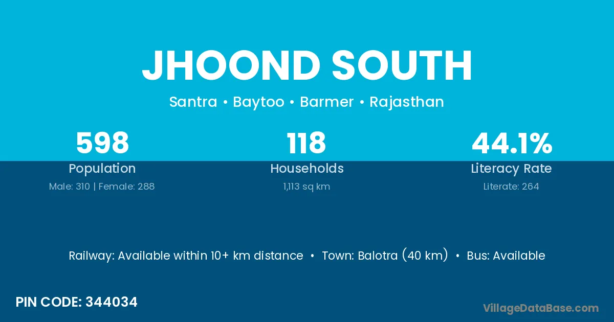 Balotra (40 km) is the nearest town to Jhoond South village for major economic activities and is located approximately 40 km away.