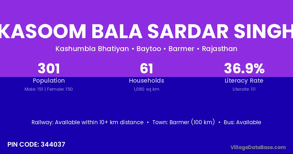 According to Census 2011 information, the village code of Kasoom Bala Sardar Singh village is 344037.