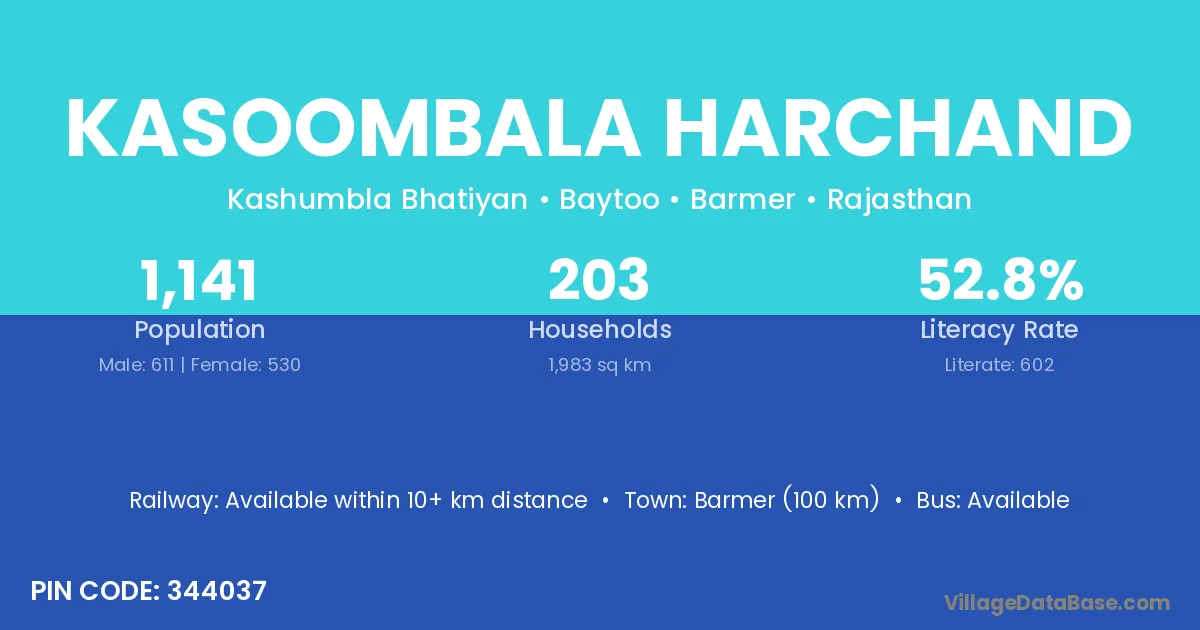 Barmer (100 km) is the nearest town to Kasoombala Harchand village for major economic activities and is located approximately 100 km away.