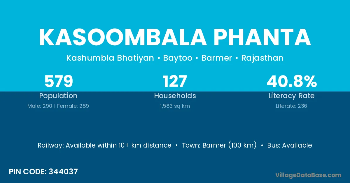 Barmer (100 km) is the nearest town to Kasoombala Phanta village for major economic activities and is located approximately 100 km away.