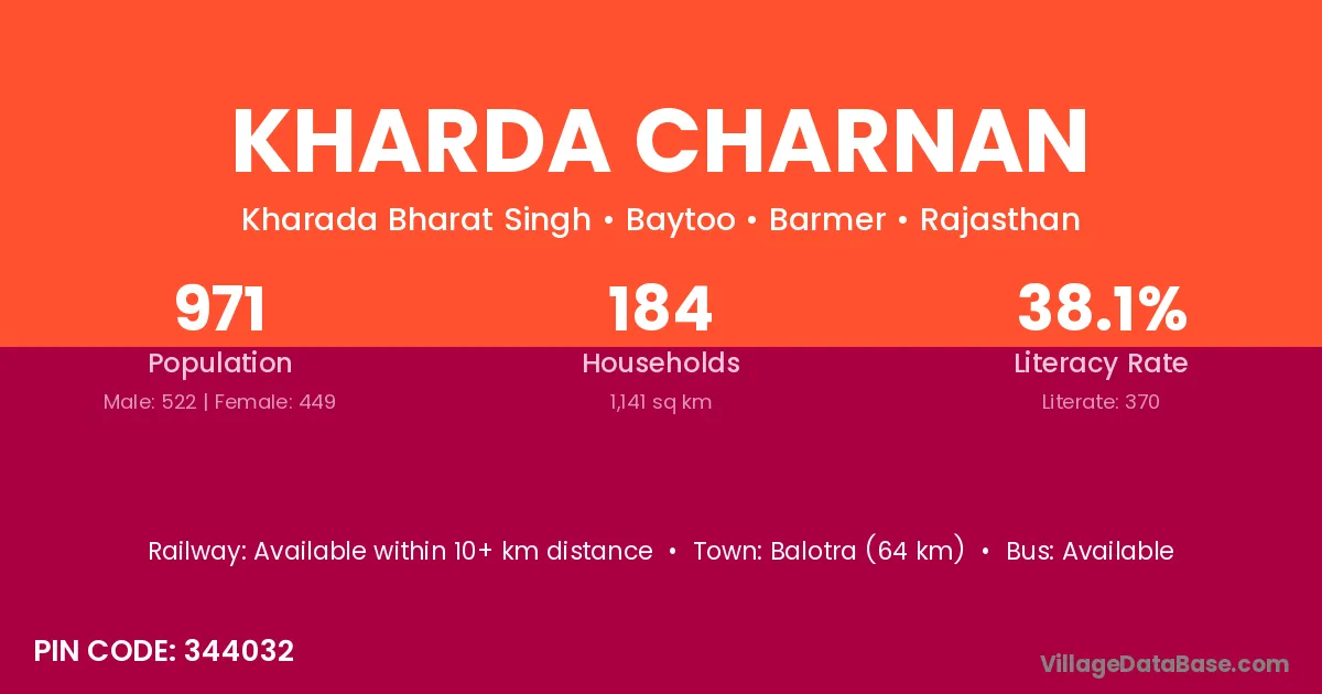 Balotra (64 km) is the nearest town to Kharda Charnan village for major economic activities and is located approximately 64 km away.