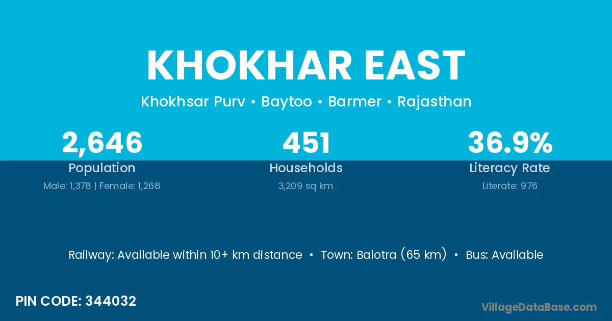Balotra (65 km) is the nearest town to Khokhar East village for major economic activities and is located approximately 65 km away.