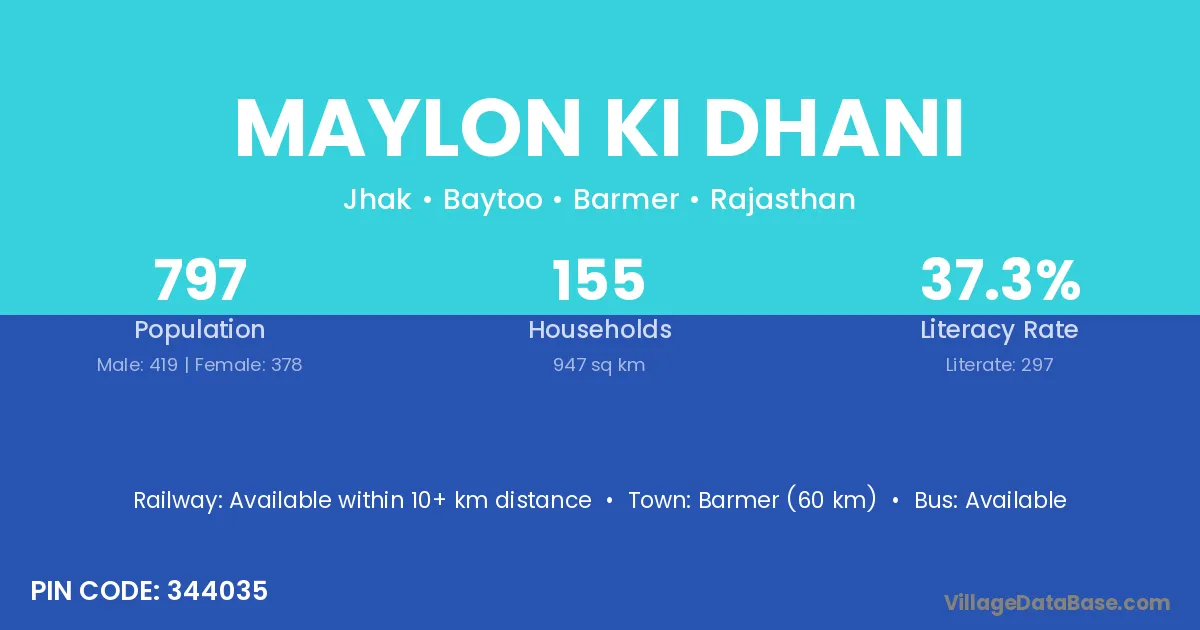 Barmer (60 km) is the nearest town to Maylon Ki Dhani village for major economic activities and is located approximately 60 km away.