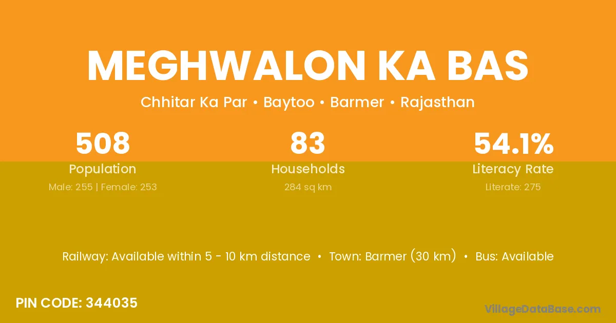 Meghwalon Ka Bas village has a total population of 508 people, of which 255 are males and 253 are females.
