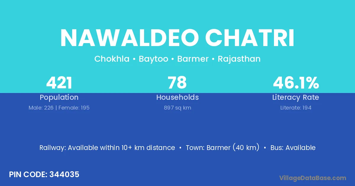 Barmer (40 km) is the nearest town to Nawaldeo Chatri village for major economic activities and is located approximately 40 km away.