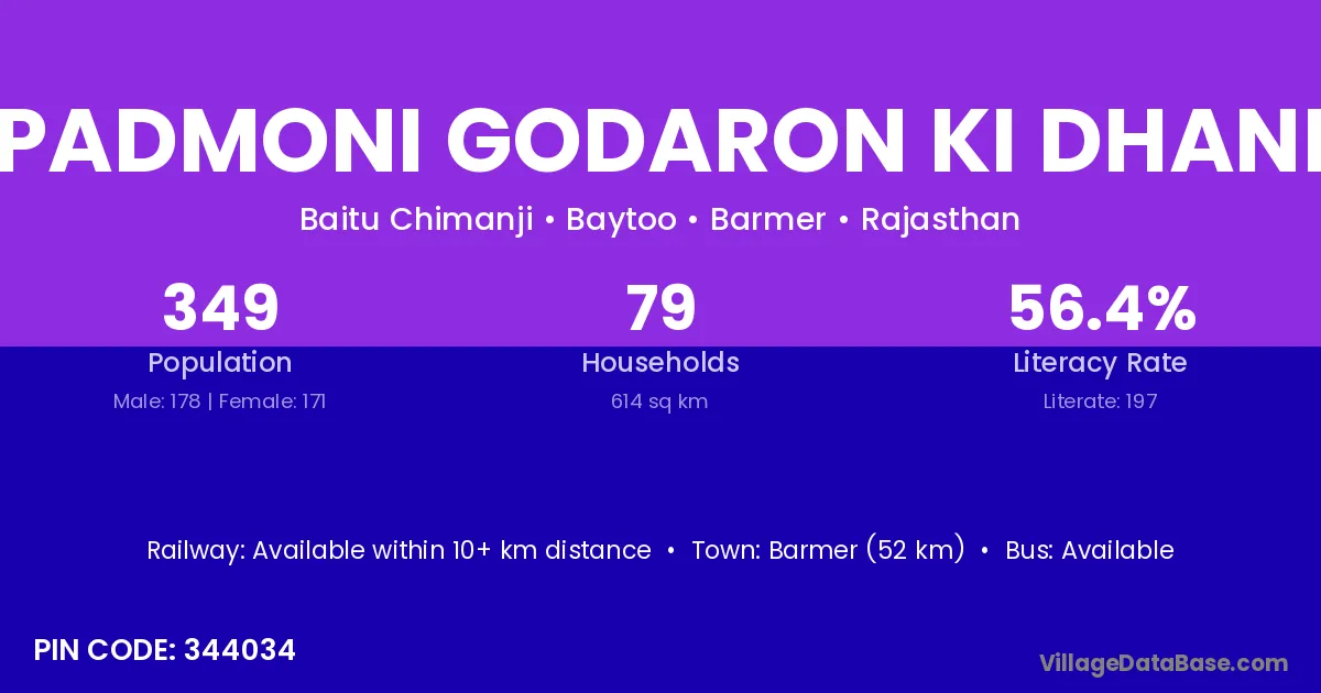 Barmer (52 km) is the nearest town to Padmoni Godaron Ki Dhani village for major economic activities and is located approximately 52 km away.