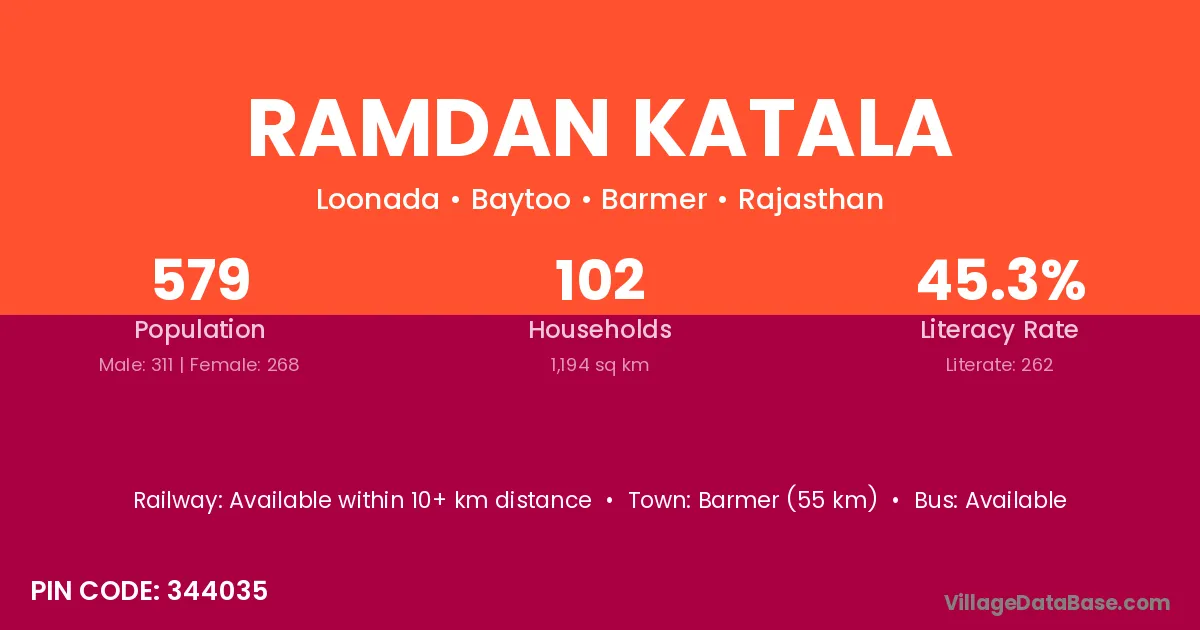 Barmer (55 km) is the nearest town to Ramdan Katala village for major economic activities and is located approximately 55 km away.