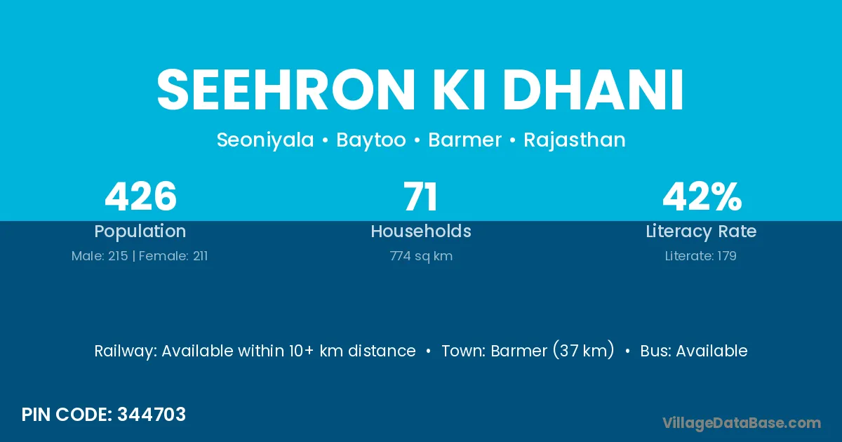 Seehron Ki Dhani village has a total population of 426 people, of which 215 are males and 211 are females.