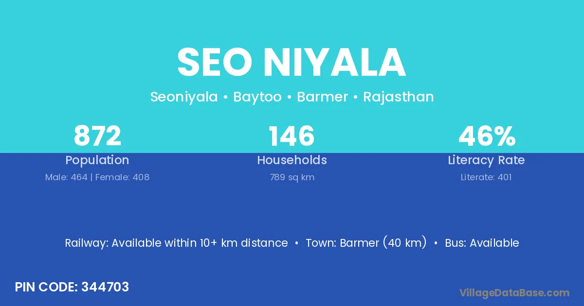 Barmer (40 km) is the nearest town to Seo Niyala village for major economic activities and is located approximately 40 km away.