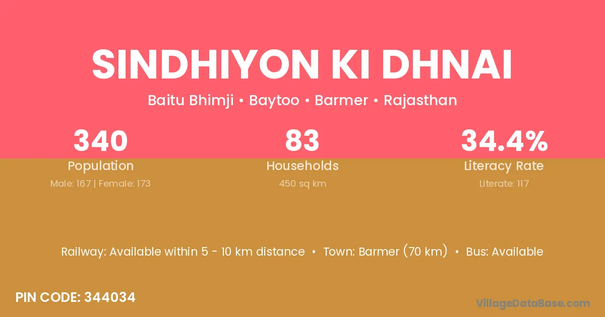 Barmer (70 km) is the nearest town to Sindhiyon Ki Dhnai village for major economic activities and is located approximately 70 km away.