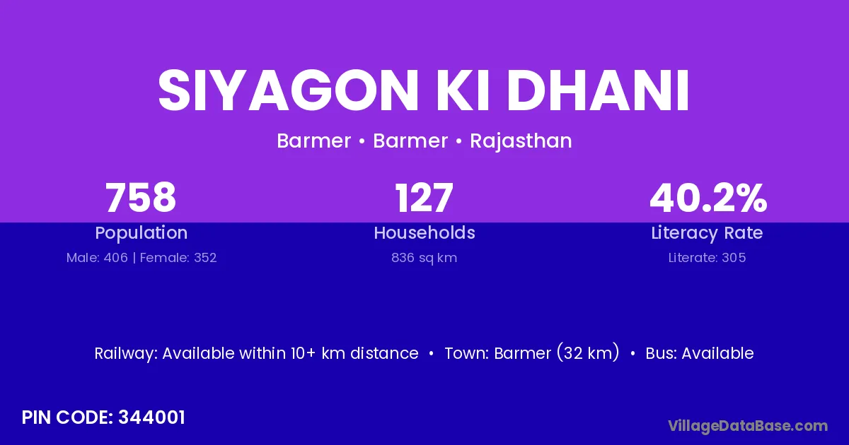 Balotra (80 km) is the nearest town to Siyagon Ki Dhani village for major economic activities and is located approximately 80 km away.